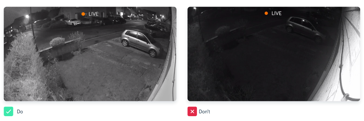 - Reflections: When you’ve chosen your camera’s position, wait until dark and take a look at the livestream on you app – make sure there’s no light reflecting from the wall onto the lens (see images below).