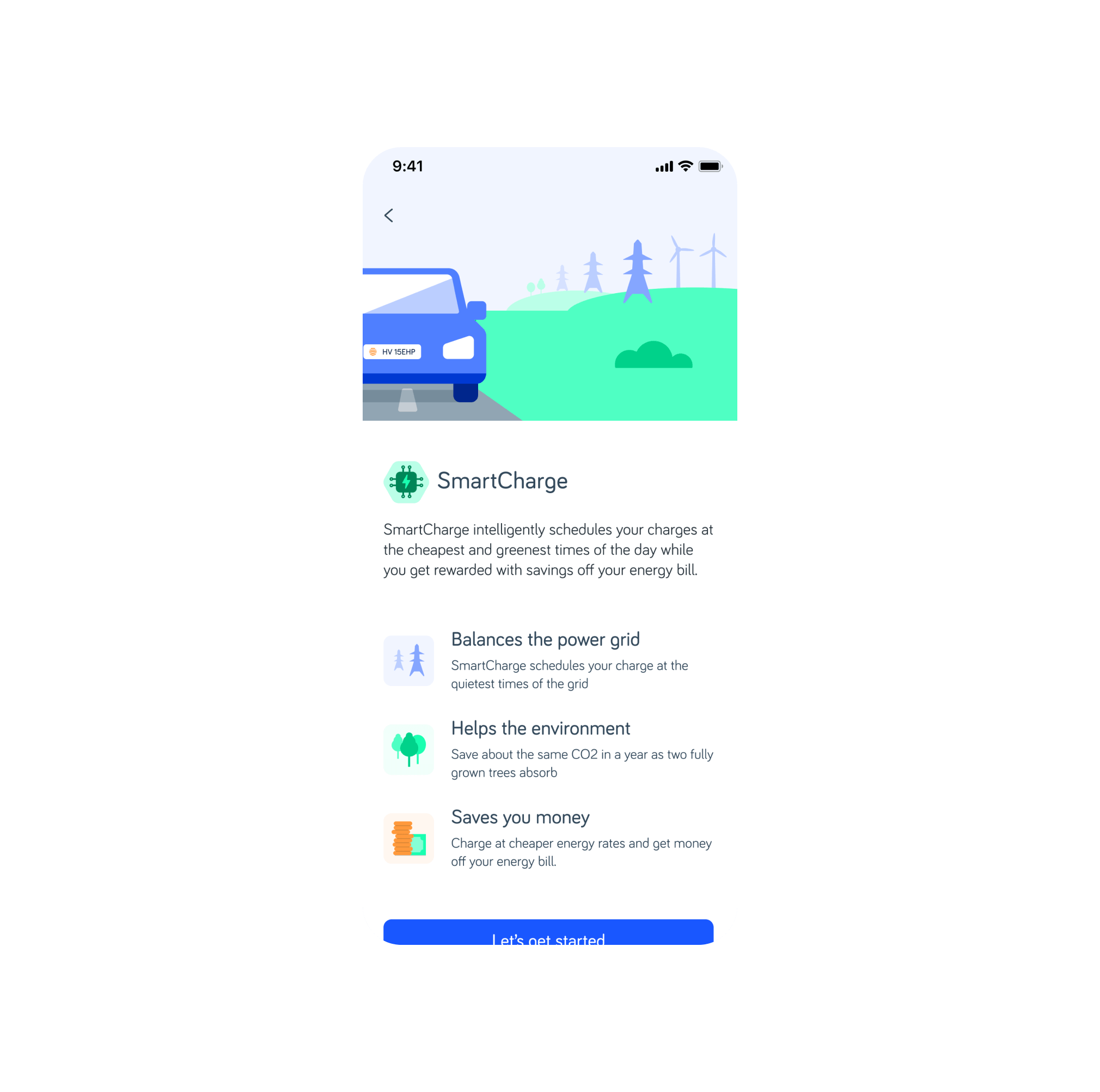 When demand on the grid is low, more of the electricity available comes from renewable sources – like wind and solar. So as well as saving you money, SmartCharge means you’ll charge with greener energy. You can see how much carbon you’ve saved in your monthly statement.