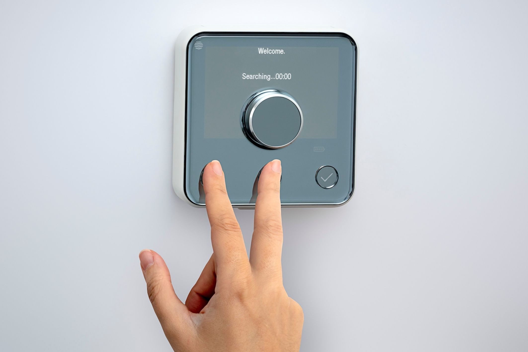 Press and hold down the 'back arrow' button and the 'menu' button on the thermostat at the same time (these are the bottom left and bottom middle buttons below the silver dial). Keep these buttons held down together until the thermostat display says 'Welcome, searching'.